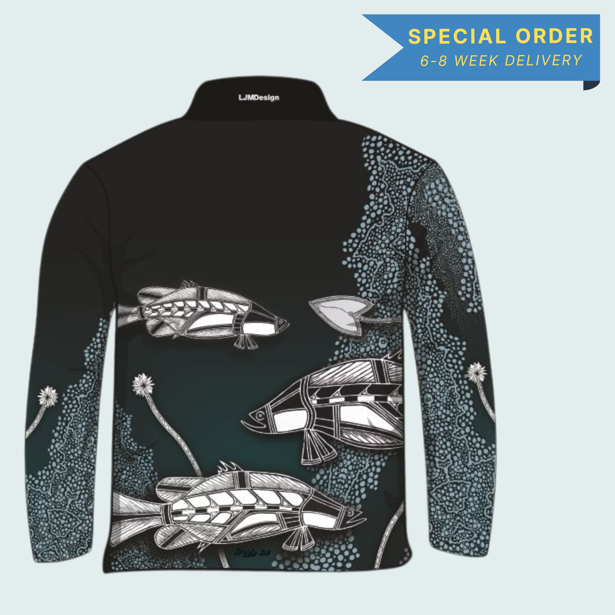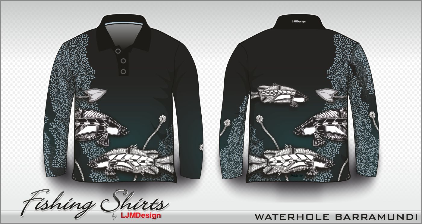 Waterhole Barramundi Indigenous Art Fishing Fishing Shirts can be ordered exactly as you want!